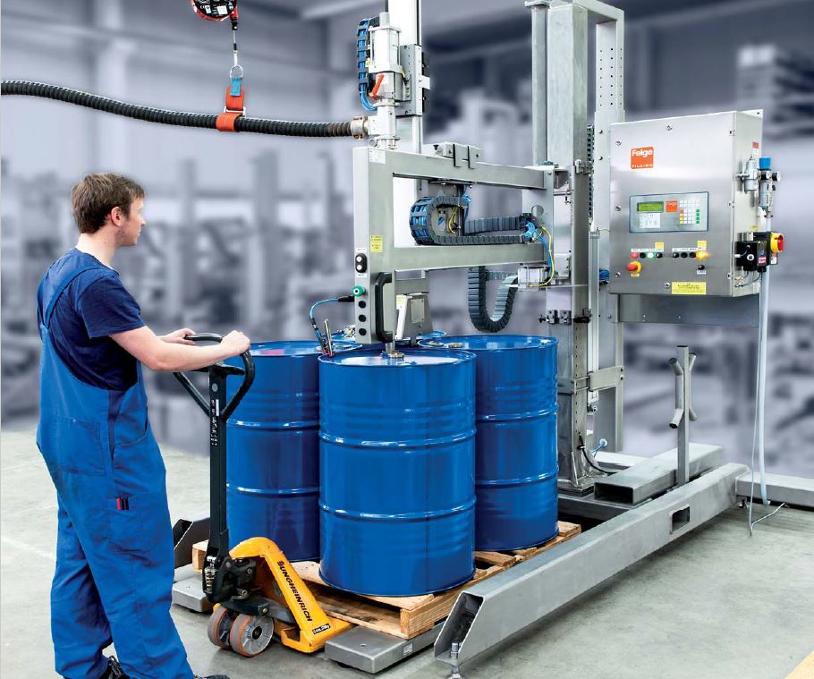 FEIGE半自動及全自動托盤式灌裝設備適用于罐、提桶、桶及IBC桶,矩陣式攝像系統(tǒng)可自動檢測各個容器的開口,并進行自動灌裝,可連接多個輸送系統(tǒng)。